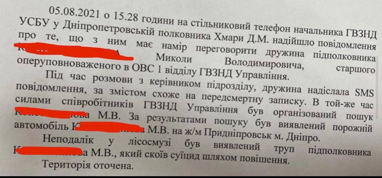 В документе также говорится, что начальнику департамента защиты национальной государственности СБУ в Днепропетровской области днем 5 августа позвонила жена погибшего, которая переслала собеседнику СМС, похожую на предсмертную записку.