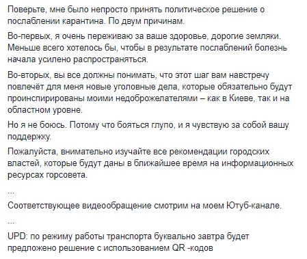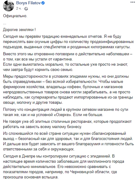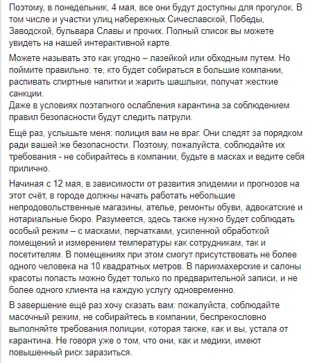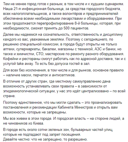 "Далее мы надеемся на сознательность, ответственность и дисциплину каждого из вас, уважаемые земляки. Поэтому с сегодняшнего дня, по решению специальной комиссии, в городе будут открыты не только аптеки, супермаркеты, бакалеи, магазины с техникой, АЗС и банки, но также и химчистки, СТО, мастерские по ремонту разного оборудования. Кофейни и рестораны смогут работать как по адресной доставке, так и с услугой take away. То есть без допуска гостей в зал", - написал мэр Днепра.