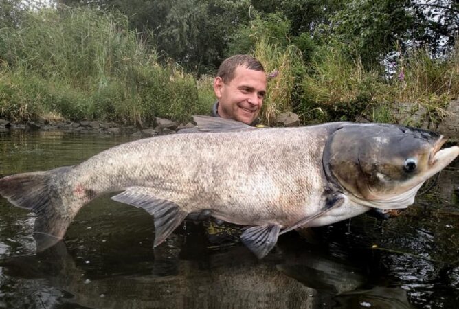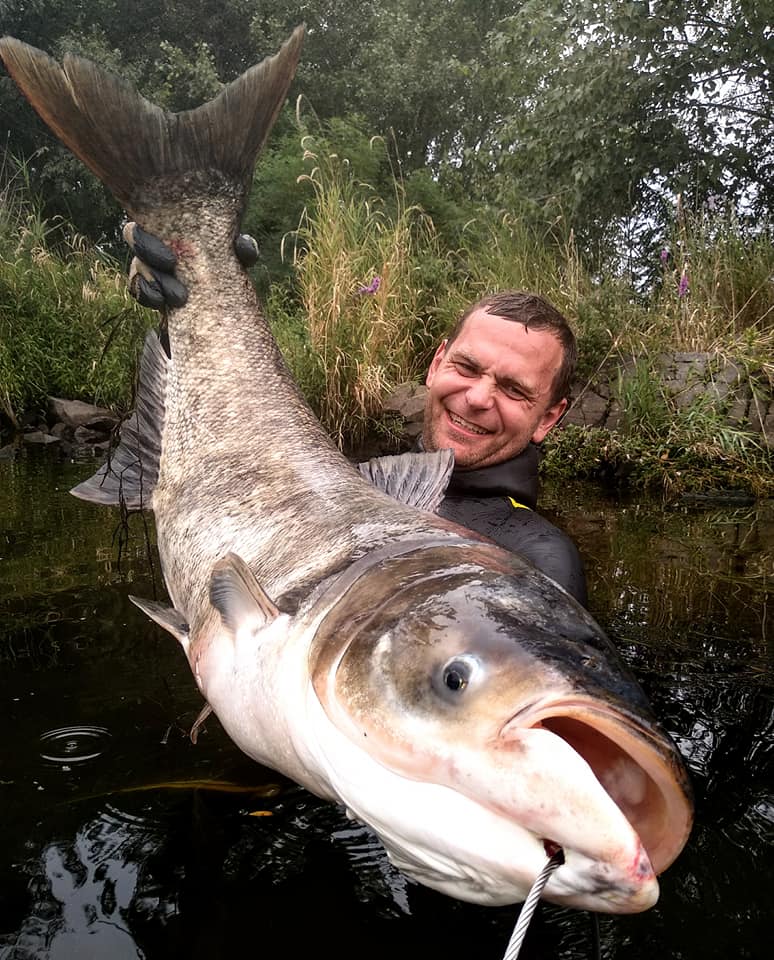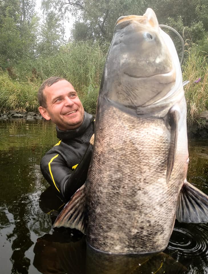 В Днепре подводный охотник поймал гигантский трофей - толстолобика, длиной в человеческий рост.