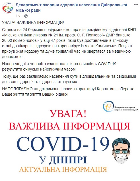 Во вторник, 24 марта, в 21-й больнице Днепра умер житель Каменского, которого госпитализировали с подозрением на коронавирус.