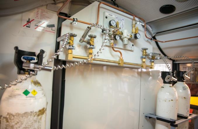 В обоих машинах в ходе переоборудования была установлена плотная перегородка, отделяющая кабину водителя от салона, удалили два ряда сидений, а на их месте установили стальные конструкции для транспортировки кислородных баллонов.