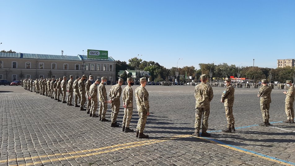 Репетиция проходит площади Свободы в Харькове. В ней принимают участие несколько сотен курсантов Харьковского национального университета воздушных сил им. Ивана Кожедуба, военный оркестр.