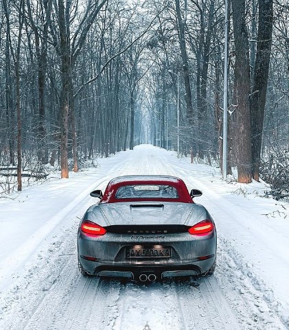В Харькове на заснеженной дороге заметили дорогой спортивный автомобиль Porsche 718 Boxster GTS.