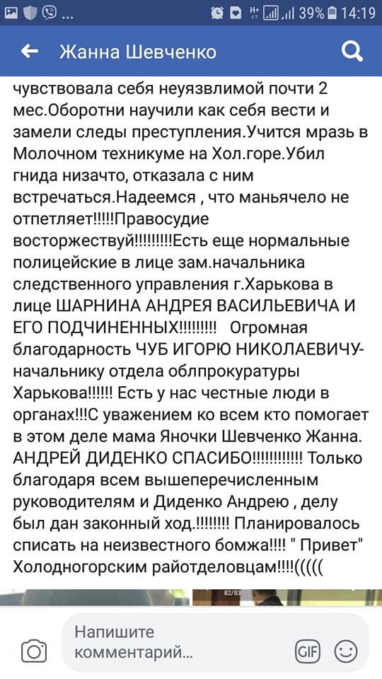 В июне в районе Холодной Горы в Харькове пропала 16-летняя девушка Яна Шевченко (Криворучко), через несколько недель было найдено ее тело с изуродованным лицом.