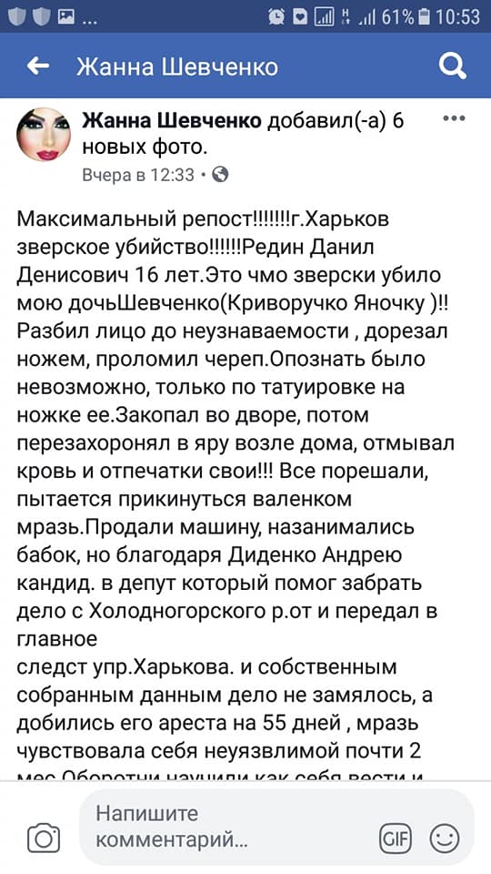 Об этом пишет мать убитой Жанна Шевченко у себя на странице в Facebook.