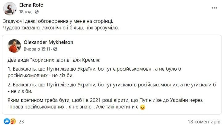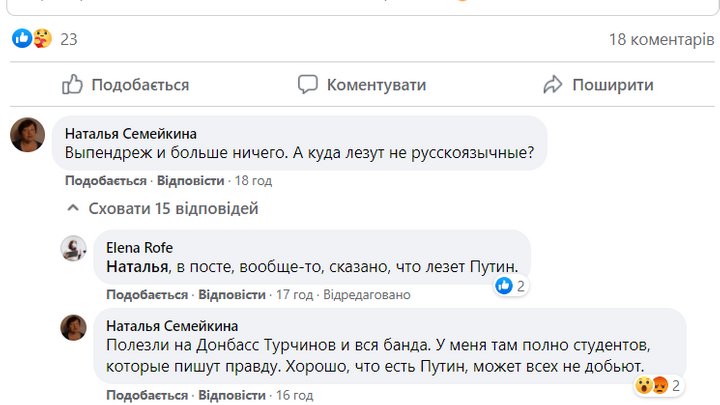 Таким образом они отреагировали на пропутинский комментарий преподавательницы кафедры гуманитаристики и искусствоведения Натальи Семейкиной под постом журналиста и переводчика Александра Михельсона о "полезных идиотах для Кремля".