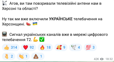 Кроме того, на Херсонщине возобновлена трансляция украинского телевидения. Об этом сообщил заместитель руководителя Офиса президента Кирилл Тимошенко.