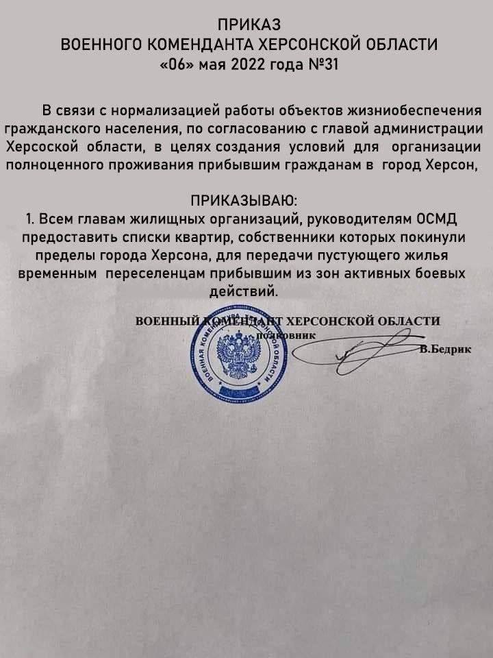 Он опубликовал соответствующий "приказ" незаконного так называемого "военного коменданта" Херсонской области.