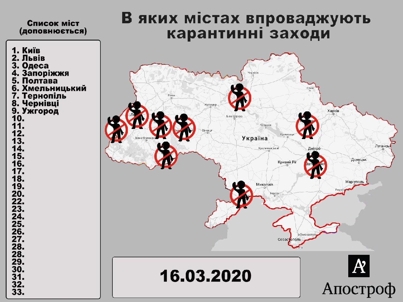 По состоянию на 16:00 16 марта карантин внедрили в 9 городах Украины. Среди них: Киев, Львов, Одесса, Запорожье, Полтава, Хмельницкий, Тернополь, Черновцы, Ужгород.