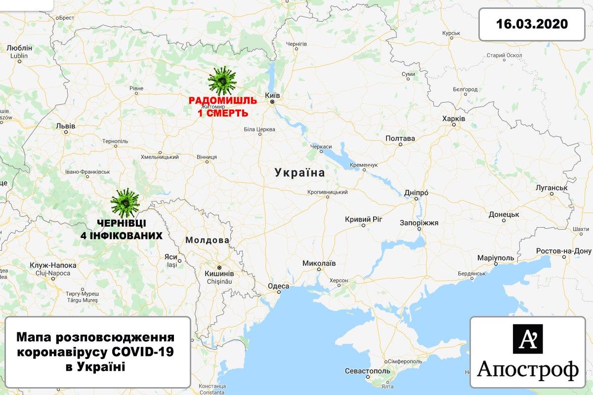 По состоянию на понедельник, 16 марта, в Украине зафиксировали еще два случая коронавируса - в Черновицкой области, а в Житомирской области зафиксировали первую смерть от COVID-19.