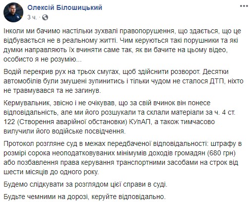 "Водитель, конечно и не ожидал, что за свой поступок он понесет ответственность, но мы его разыскали и составили материалы по ч. 4 ст. 122 (Создание аварийной обстановки) КоАП, а также временно изъяли его водительское удостоверение. Протокол рассмотрит суд в пределах предусмотренной ответственности штрафа в размере 40 необлагаемых минимумов доходов граждан (680 грн) или лишение права управления транспортными средствами на срок от 6 месяцев до 1 года", - написал Билошицкий.