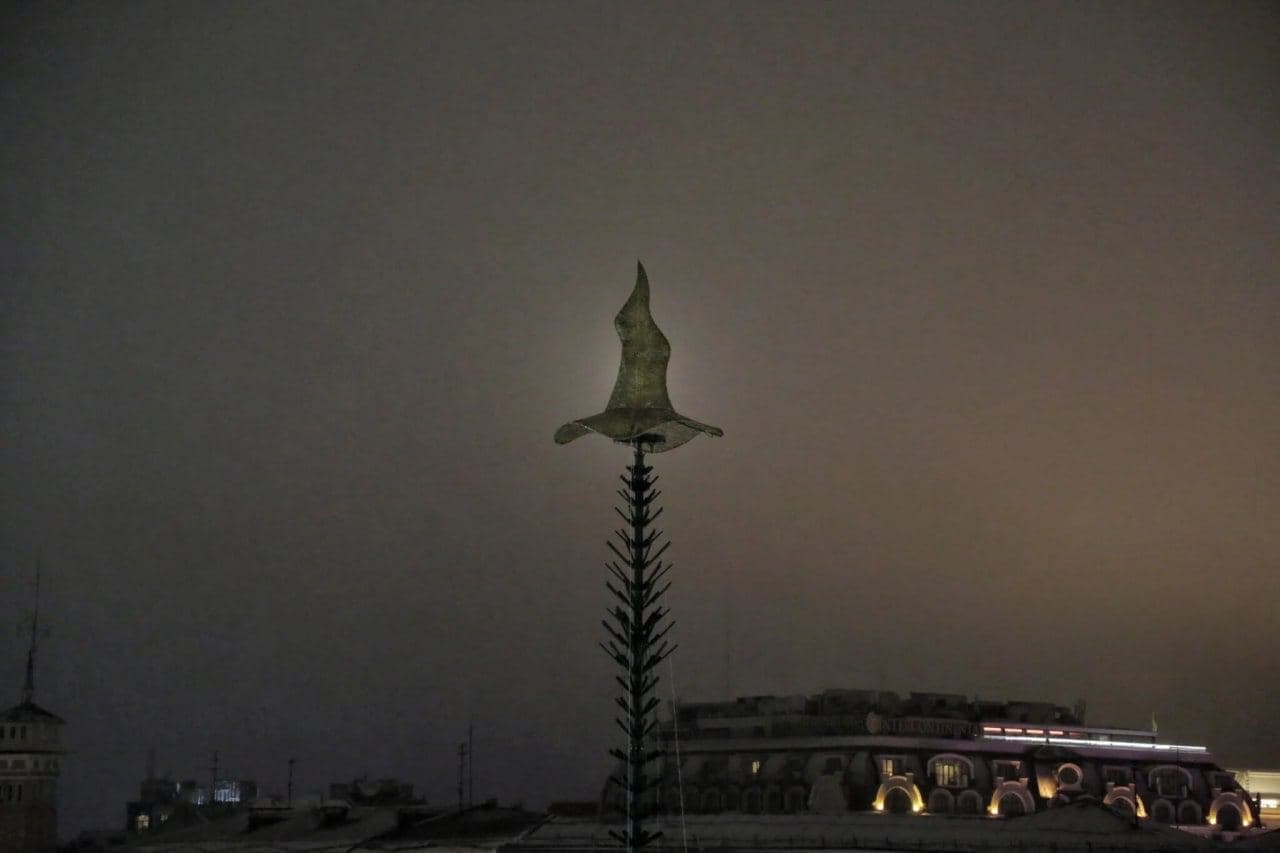 На Софийской площади в Киеве начали установку главной елки страны, у нее на верхушке будет шляпа вместо звезды.