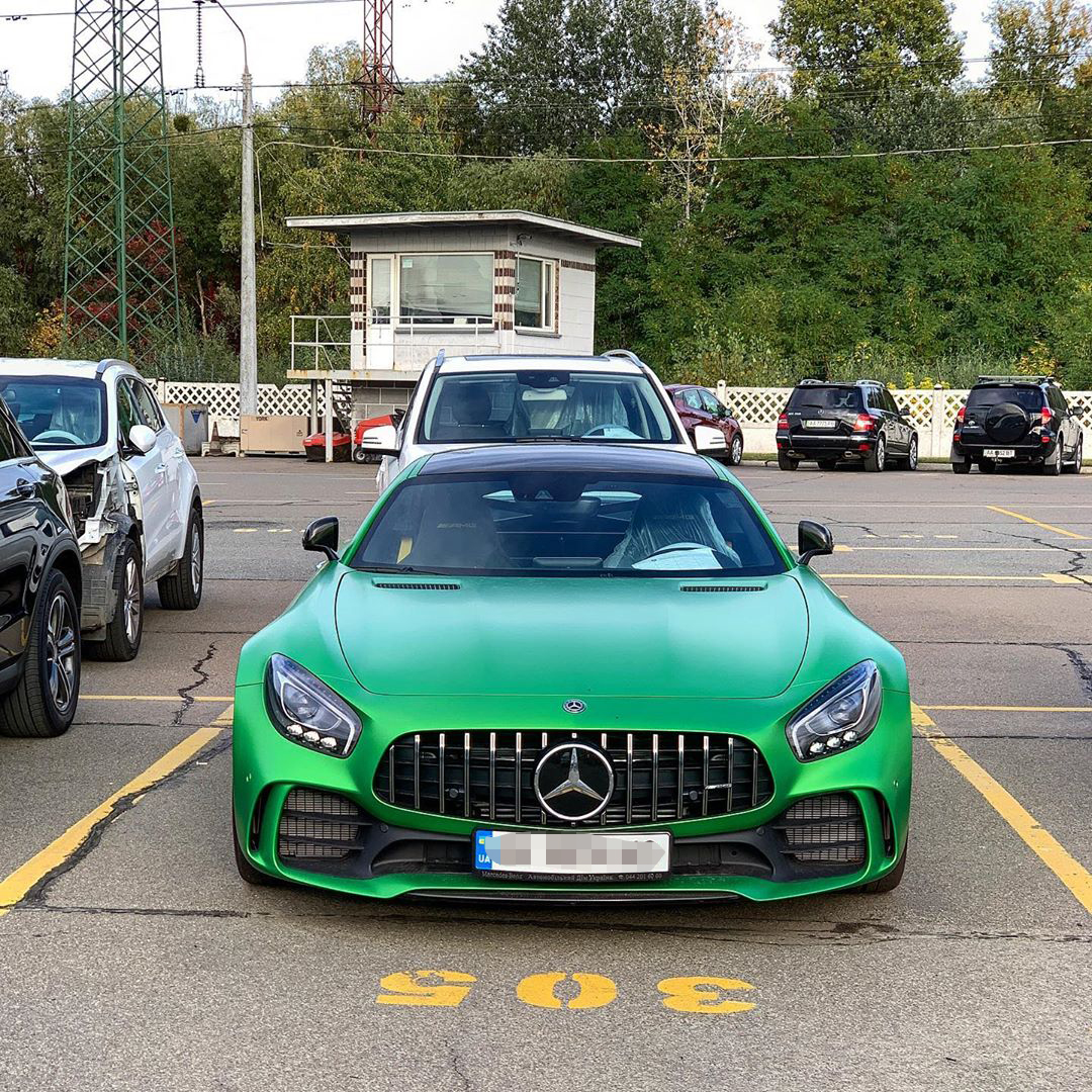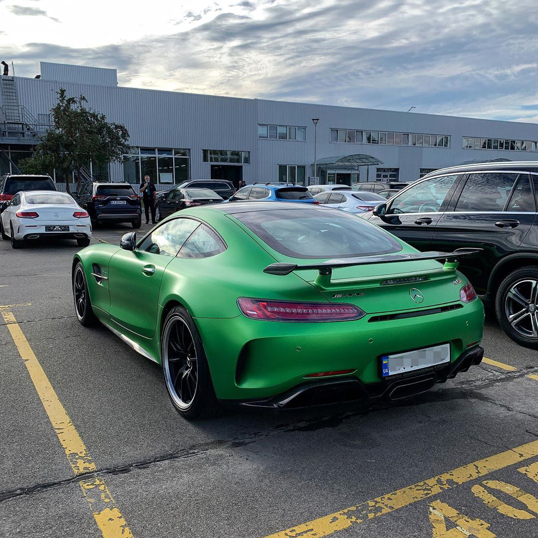 В Киеве на улице заметили роскошный суперкар Mercedes-Benz AMG GT R "ядовитого" цвета, который называют "зеленым дьяволом".