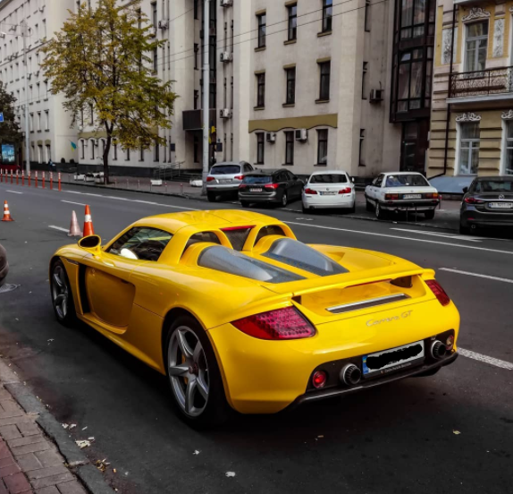 В Киеве заметили суперкар Porsche Carrera GT "ядовитого" желтого цвета, производившийся с 2003 по 2006 год компанией Porsche в Лейпциге (Германия).
