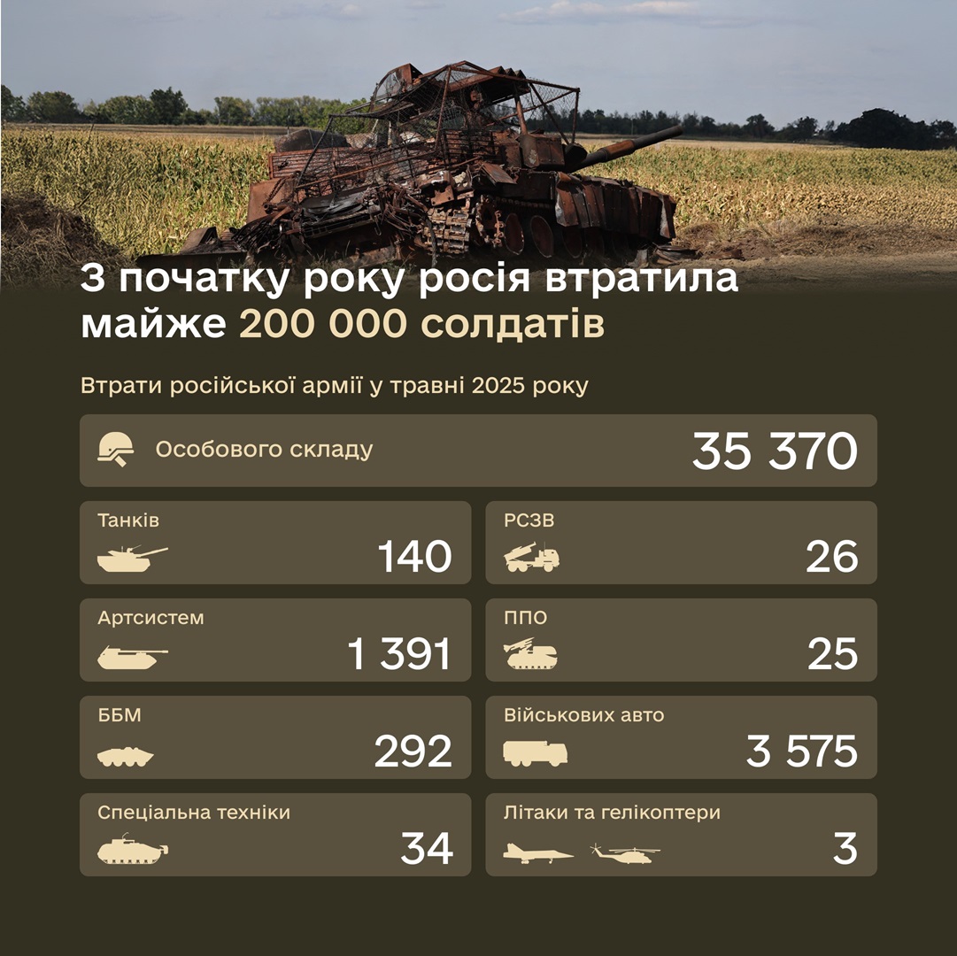 В мае 2025 года безвозвратные и санитарные потери российской армии составили 35 370 человек.