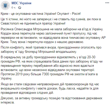"После конфликта, который произошел вчера пограничники объявят о запрете въезда блогеру Митрошиной в дальнейшем", - говорится в сообщении.