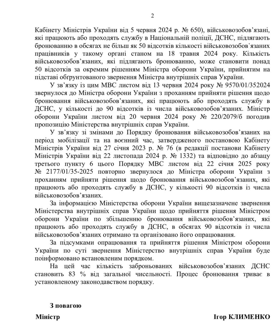 Согласно информации ведомства, на начало 2025 года в Украине забронировано 83% чрезвычайников. Долю таких работников ГСЧС планируют довести до 90%.