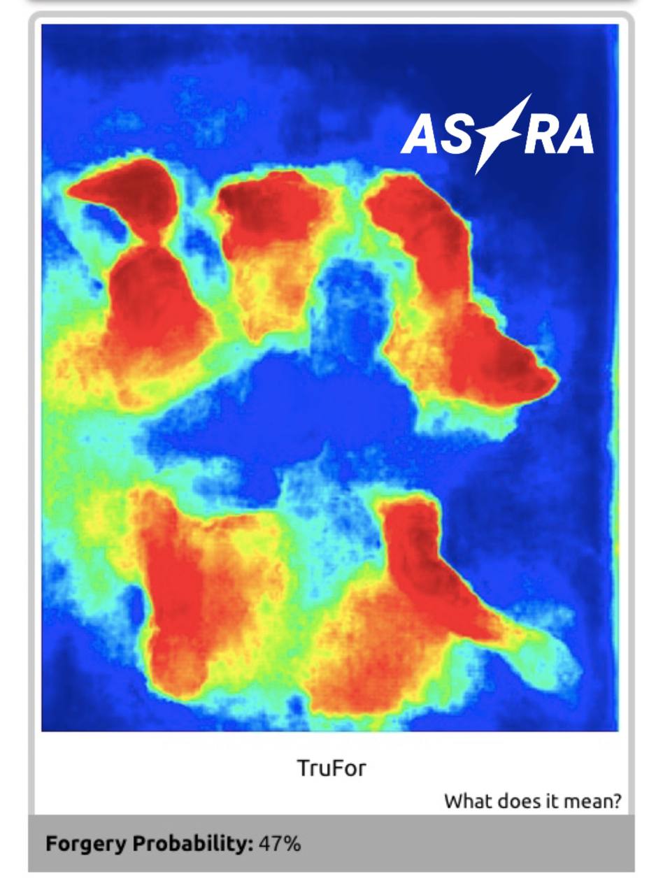 При проверке снимка методом TruFor, алгоритм показывает 47% вероятность подделки. TruFor выделяет следы возможного монтажа на отрубленных конечностях и части торса, на которой видна футболка с лозунгом "Все буде Україна!". Зато следов манипуляций не видно на голове погибшего – она не теряет форму даже при использовании TruFor.