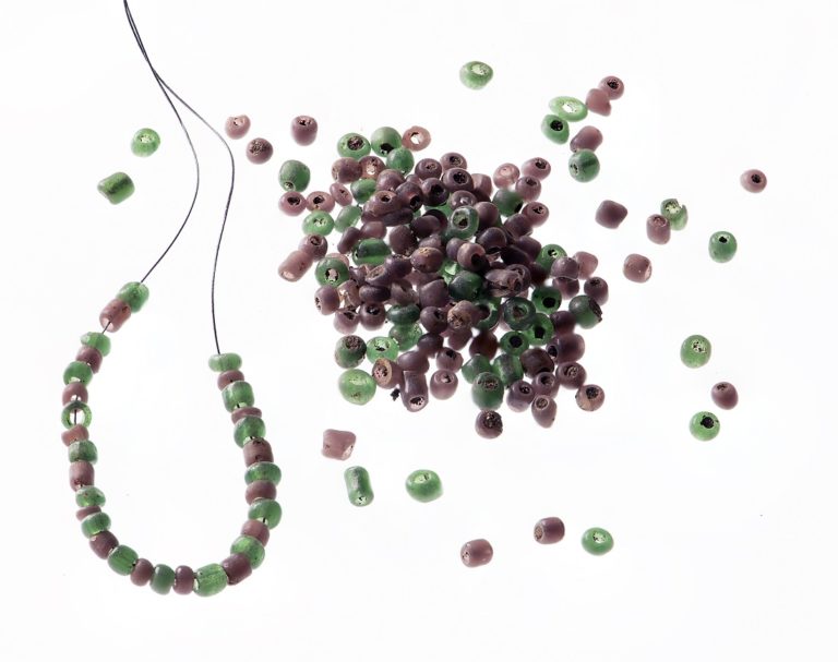 В могиле археологи нашли много миниатюрных бусин зеленого и пурпурного цветов, все они крошечные, от одного до двух миллиметров.