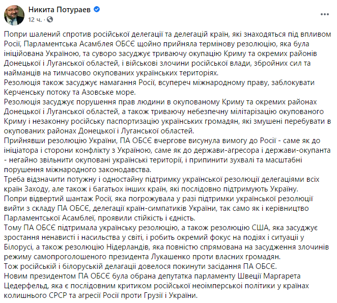 "Приняв резолюцию Украины, ПА ОБСЕ в очередной раз выдвинула требование к России – именно как к инициатору и стороне конфликта с Украиной, именно как к государству-агрессору и государству-оккупанту – немедленно освободить оккупированные украинские территории и прекратить дерзкие и масштабные нарушения международного законодательства", – подчеркнул Потураев.
