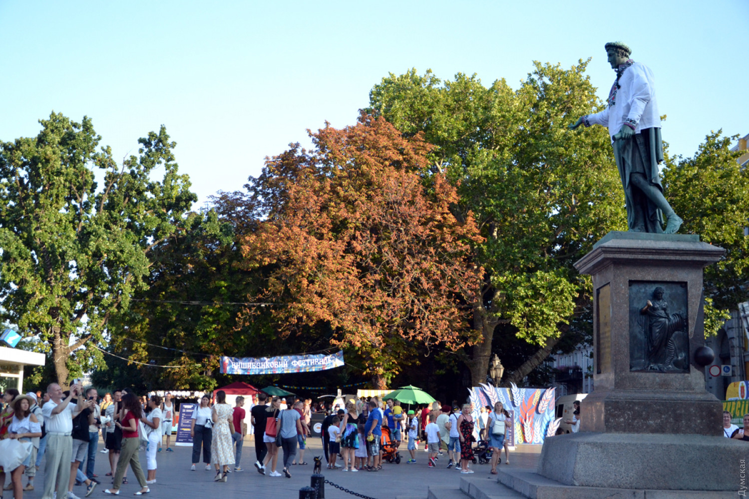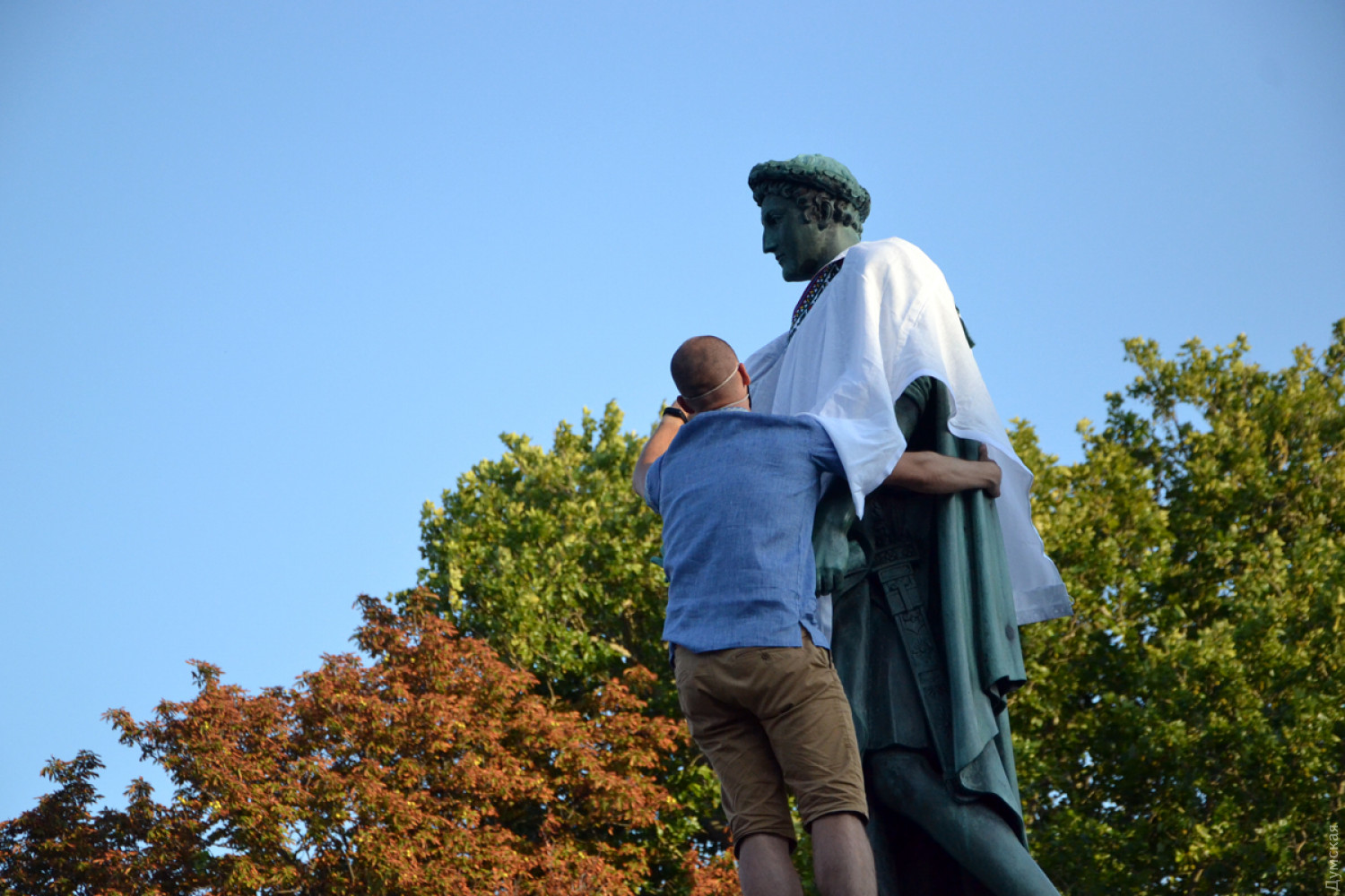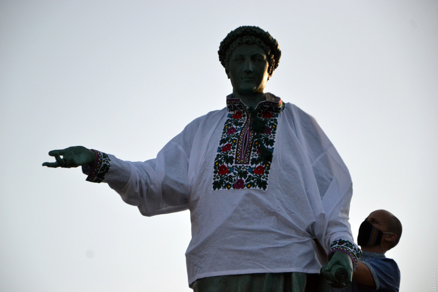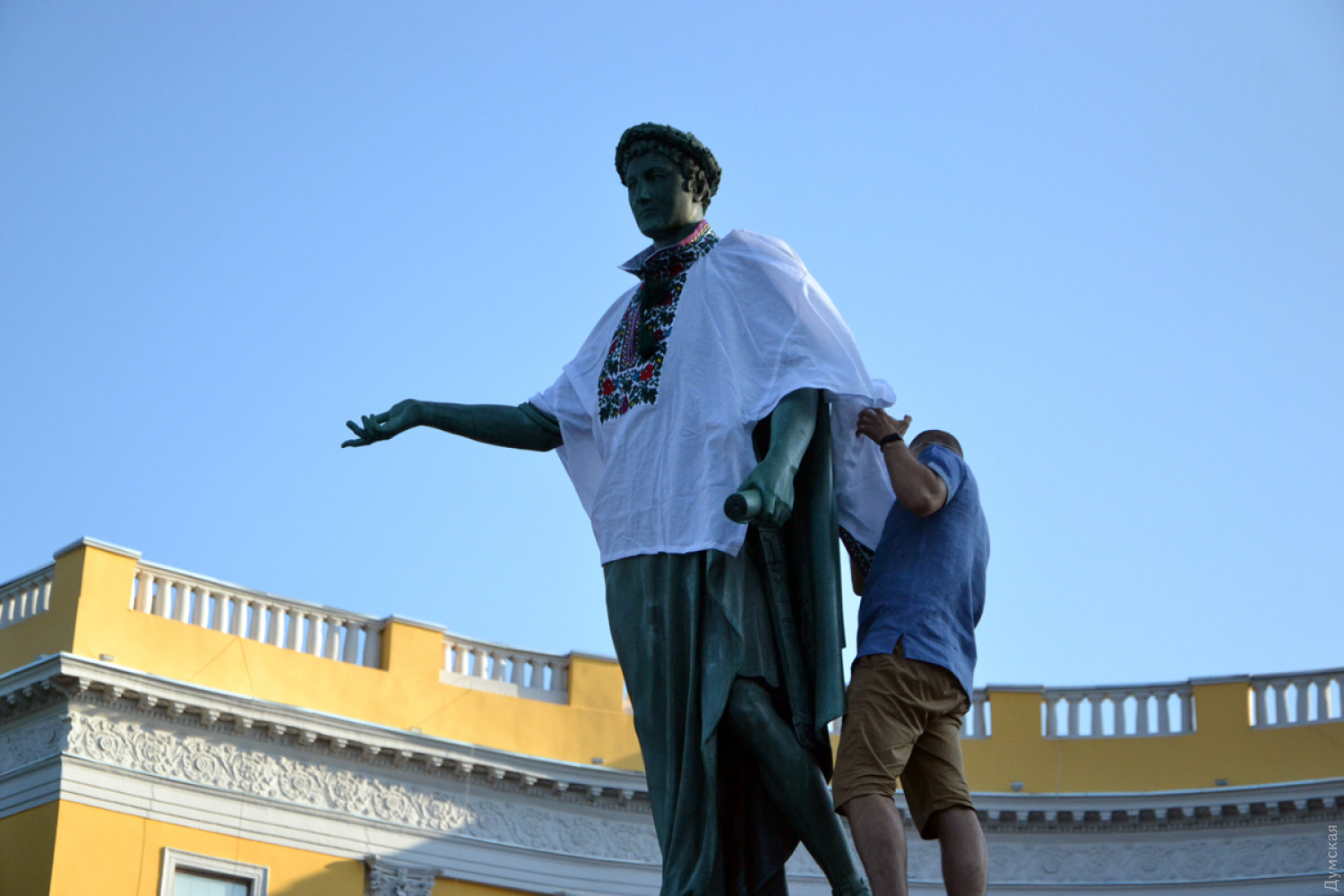 В Одессе в рамках Вышиванкового фестиваля один из символов города - памятник Дюку де Ришелье - по традиции одели в украинскую вышиванку.
