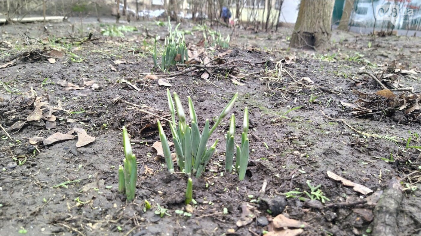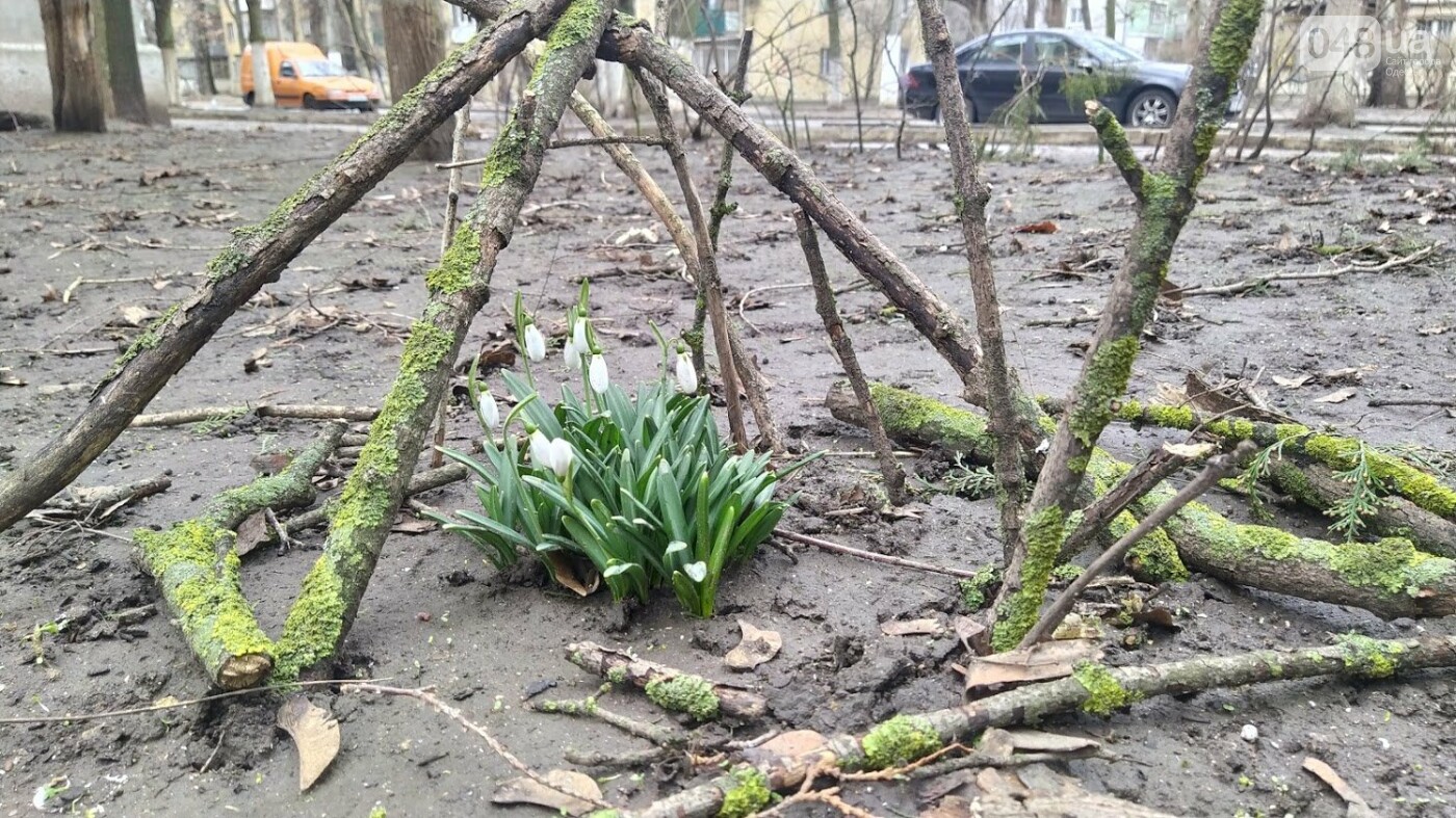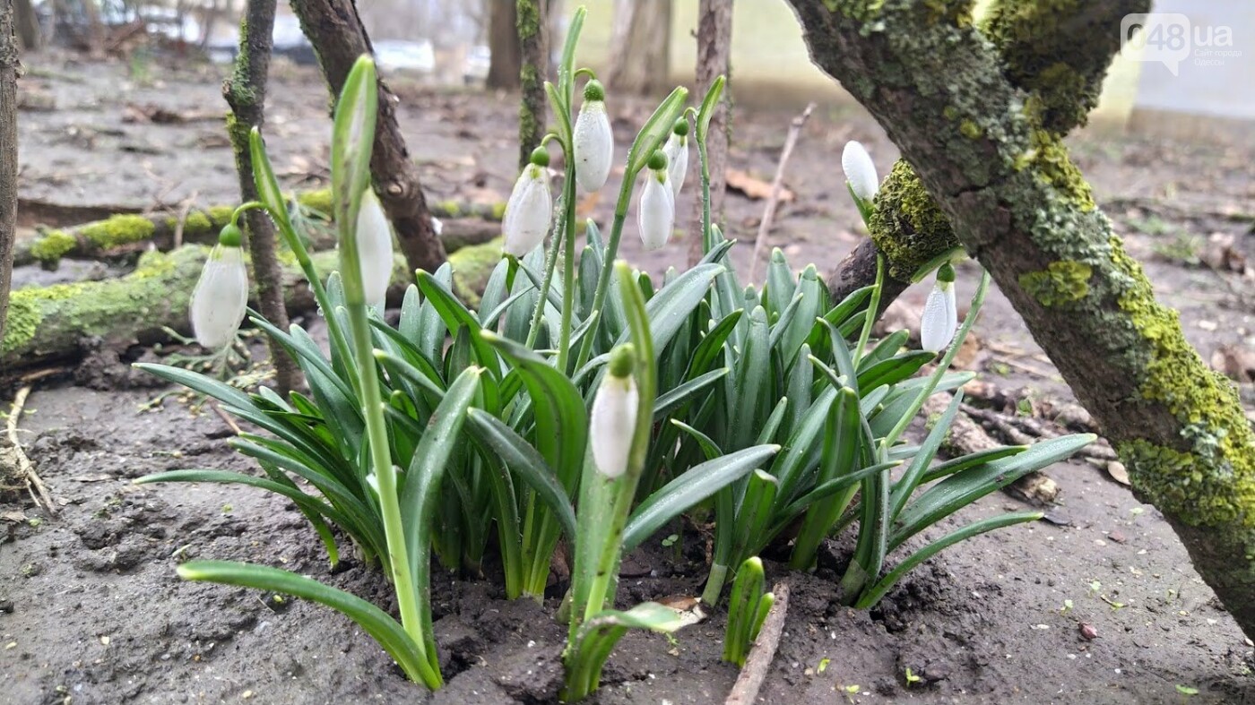 В Одессе из-за резкого потепление, которое пришло на смену снегопадам, во дворах и парках появились первоцветы, первыми в разгар февраля зацвели подснежники.