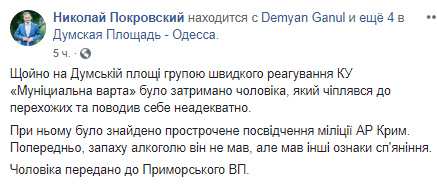 "Только на Думской площади группой быстрого реагирования КУ "Мунициальная стража" был задержан мужчина, который приставал к прохожим и вел себя неадекватно. При нем было найдено просроченное удостоверение милиции АР Крым. Предварительно, запаха алкоголя он не имел, но имел другие признаки опьянения", - говорится в сообщении.