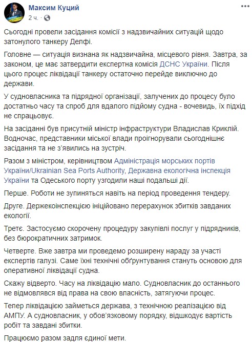 "Сегодня провели заседание комиссии по чрезвычайным ситуациям по затонувшему танкеру Delfi. Главное - ситуация признана как чрезвычайная, местного уровня. Завтра, по закону, это должна утвердить экспертная комиссия ГСЧС Украины. После этого процесс ликвидации танкера окончательно перейдет исключительно к государству", - написал чиновник.