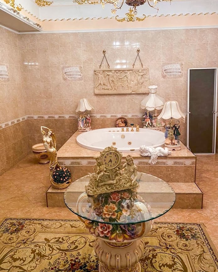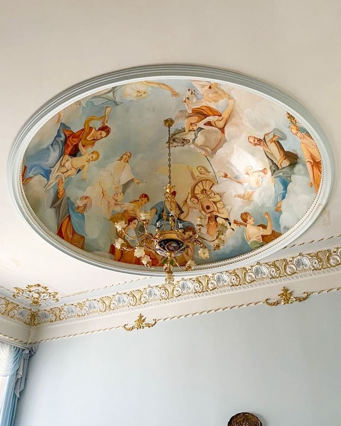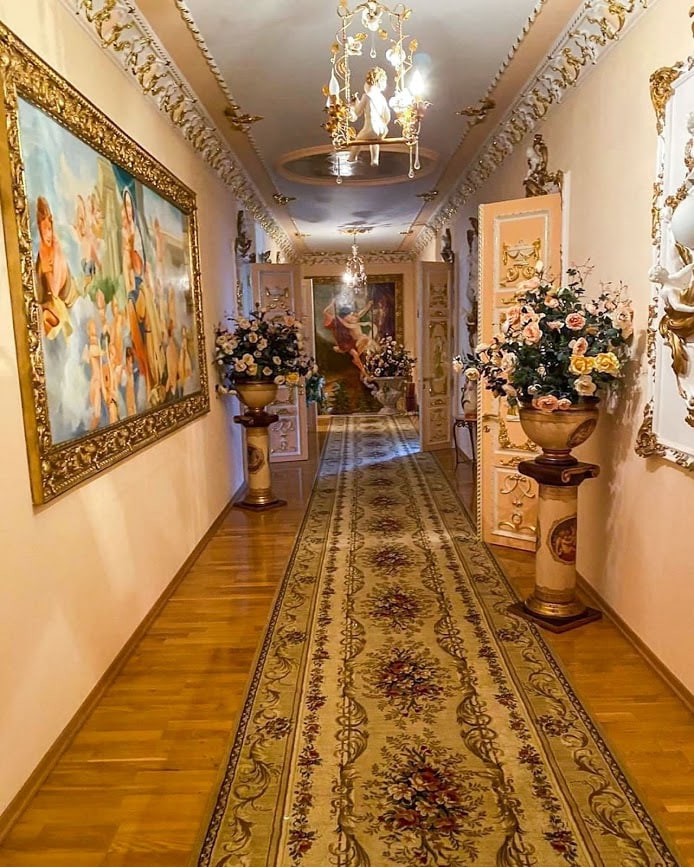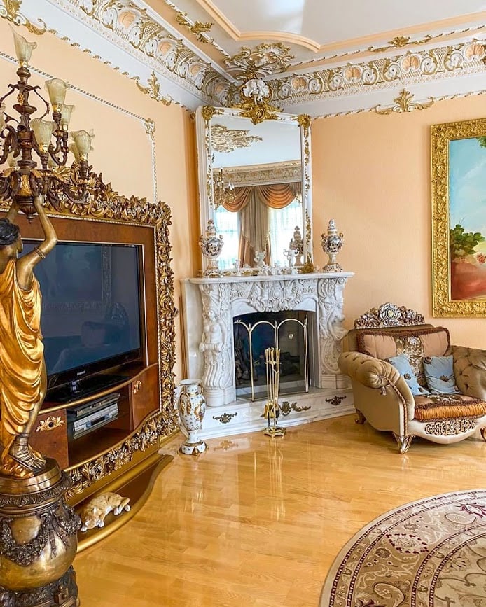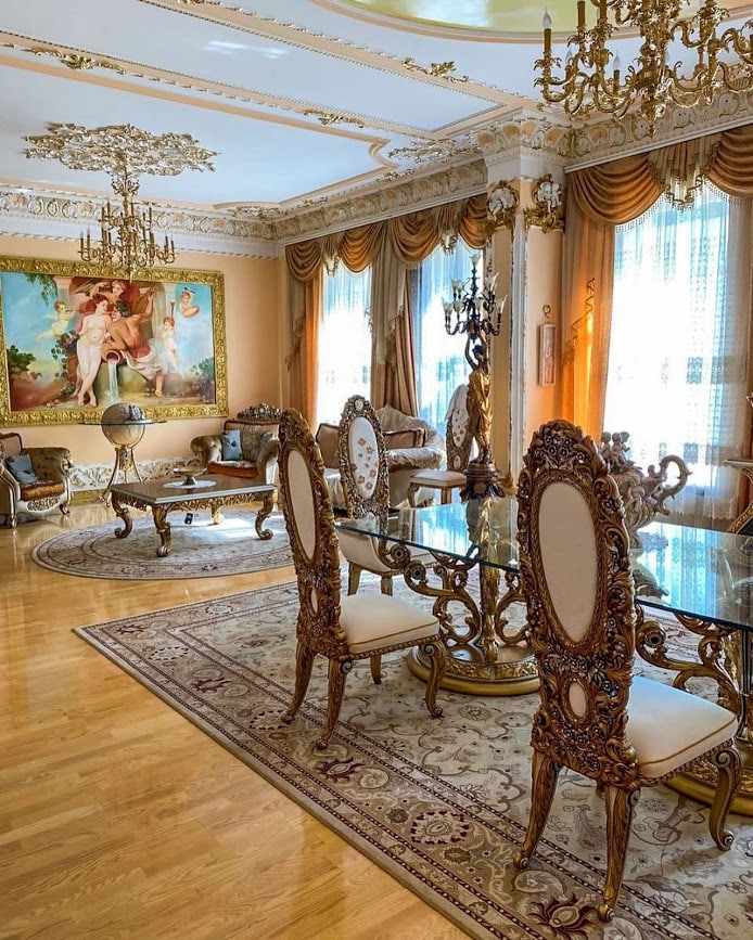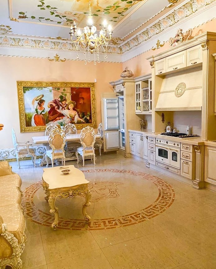 Все квартира в позолоте и дворцовой мебели с вензелями и ковкой. На потолках расписные орнаменты в стиле Сикстинской капеллы.