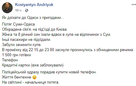 "Как доехать в Одессу с приключениями... Поезд Сумы-Одесса. Обворована семья, на подъезде к Киеву. Женщиа и 8 летний сын ехали вдвоем в купе на отдых из Сум. Другие пассажиры не подсаживались. Забыли закрыть купе. В промежутке от 22:15 до 23:00 уснули, проснулись с очищенными вещами: 1500 грн наличных, телефон, кредитные карточки (уже заблокировали)", - говорится в сообщении.