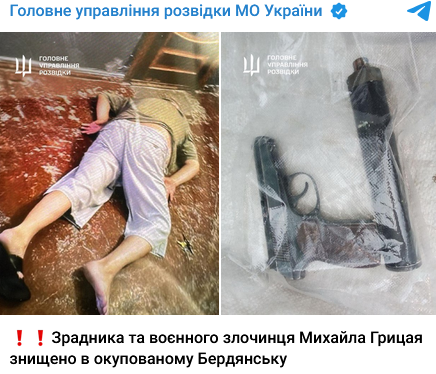 "18 июня 2025 года во временно оккупированном Бердянске Запорожской области застрелили коллаборанта, государственного предателя и военного преступника Грицая Михаила Павловича", – отметили в ГУР.