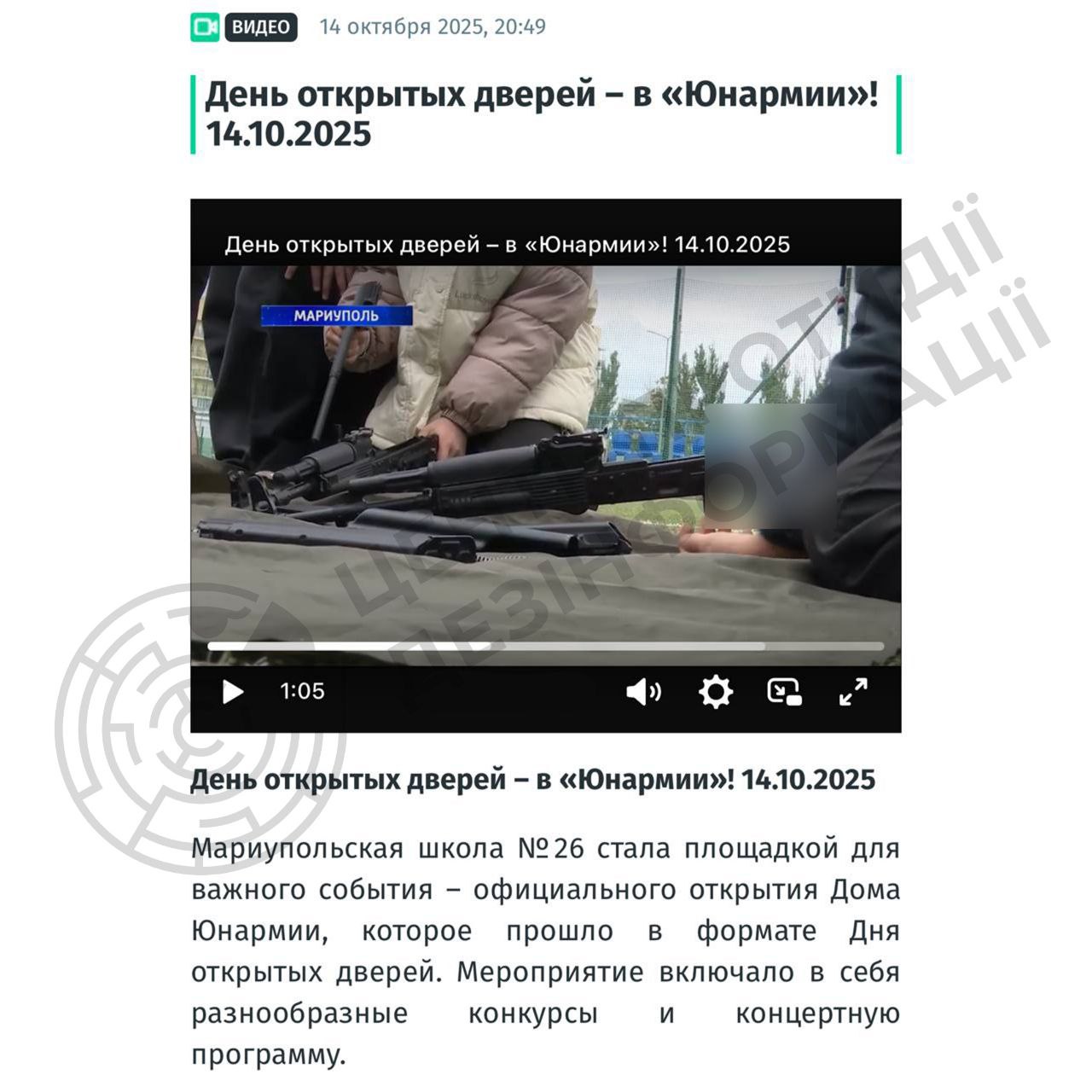 Центр противодействия дезинформации при Совете национальной безопасности и обороны Украины (СНБО) сообщил о том, что российские оккупанты в захваченном Мариуполе будут поощрять детей с восьми лет приобщаться к "юнармии".
