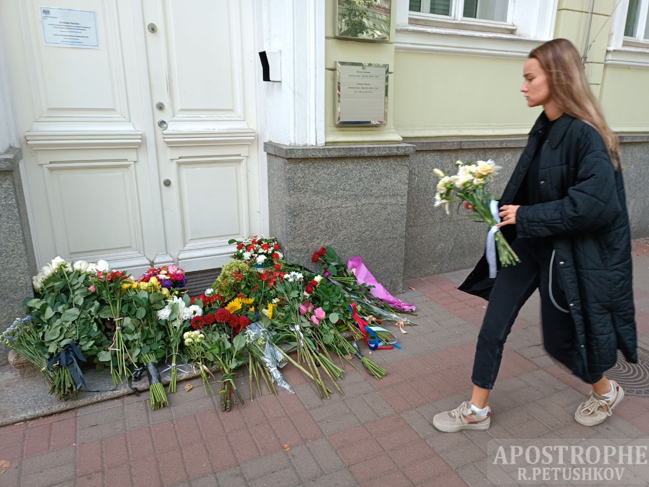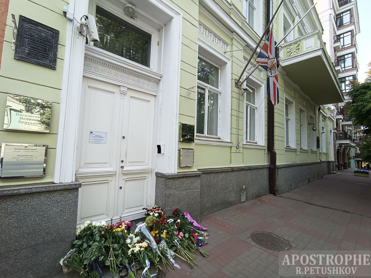 В Киеве возле посольства Великобритании чествуют память королевы Елизаветы II, которая умерла 8 сентября на 96 году жизни. Жители столицы несут цветы под здание посольства.