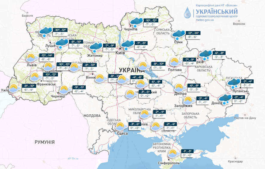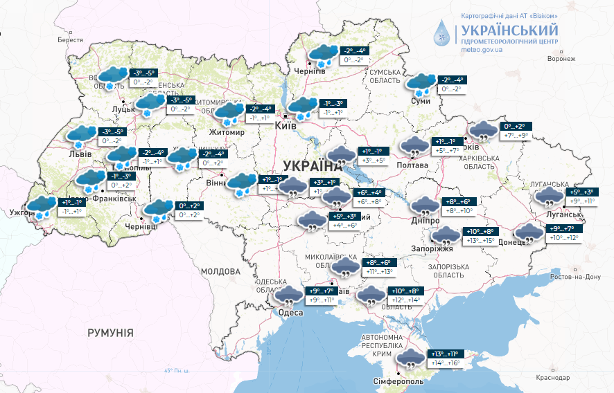 В Киеве и Киевской области облачно, небольшой снег и мокрый снег, на дорогах местами гололедица. Температура в столице ночью 1-3° мороза, днем 0-2° тепла; по региону ночью 0-5° мороза, днем от 2° мороза до 3° тепла.