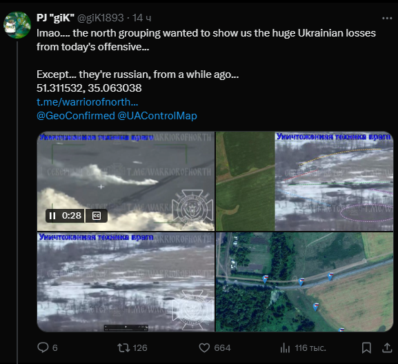 Активно распространяемое на Z-каналах "победное" видео россиян, где они якобы разбирают украинскую механизированную колонну на Курщине, оказалось нарезкой из архивных кадров, где большая часть уничтоженной или пораженной техники - российская.