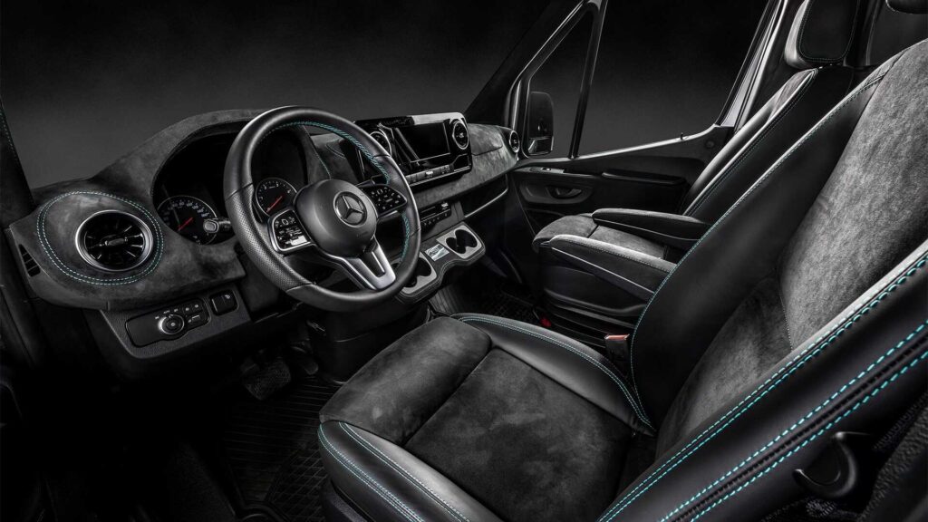 После тюнинга Mercedes Sprinter получил аэродинамический обвес и 18-дюймовые диски, а в переднем бампере увеличен воздухозаборники. В салоне сочетаются кожа и алькантара с контрастной прострочкой.