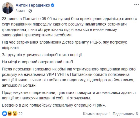 "Во время задержания злоумышленник достал гранату РГД-5, которую угрожал взорвать. За руку он держал сотрудника полиции. После переговоров злоумышленник обменял удерживаемого работника уголовного розыска на начальника УКР ГУНП в Полтавской области полковника полиции Шияна, с которым он поехал на предоставленном, согласно его требований, автомобиле "Богдан", - написал Геращенко.