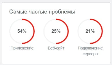Самой частой проблемой является ошибка приложения - 54%. На долю проблем с веб-сайтом приходится 25%, подключения сервера - 21%.