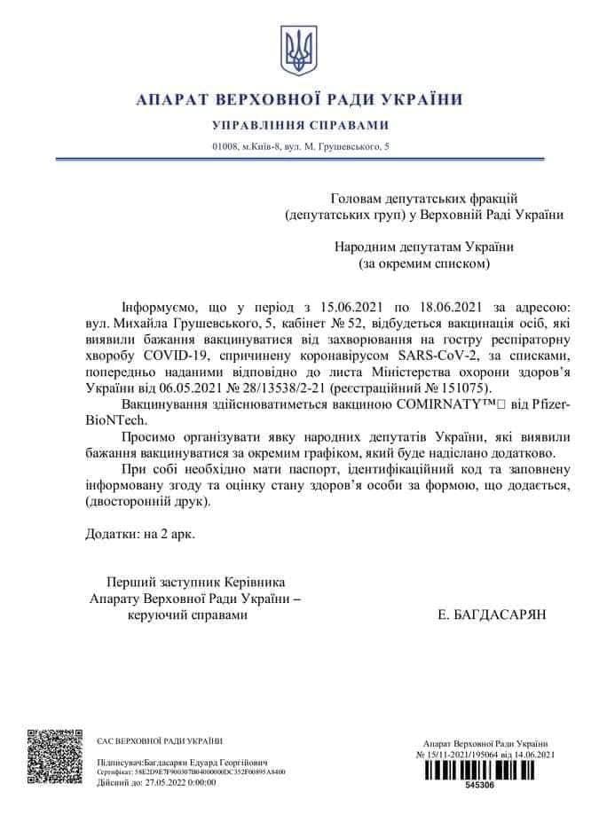 Согласно документу, 15-18 июня состоится вакцинация нардепов с использованием вакцины Comirnaty производства Pfizer-BioNTech. Прививки будут делать в помещении Верховной Рады.