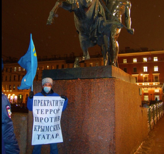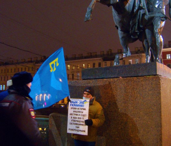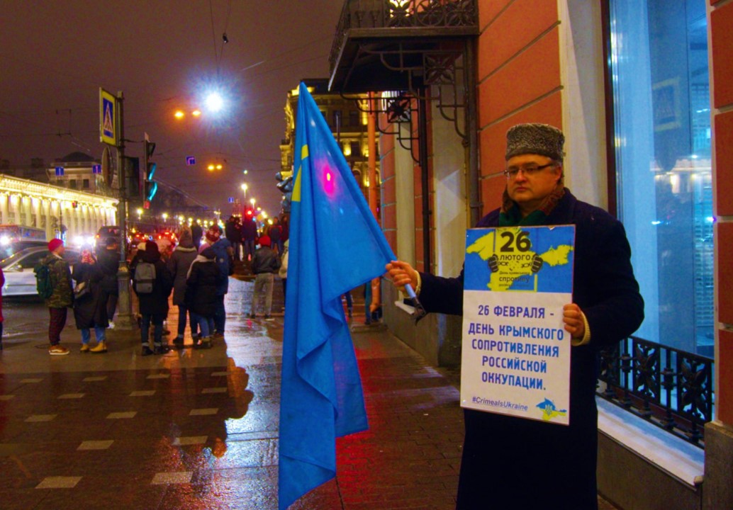 Одиночные пикеты прошли в родном городе Владимира Путина, Санкт-Петербурге, на Невском проспекте, напомнив, что семь лет назад российские диверсионные отряды незаконно захватили власть на Крымском полуострове.