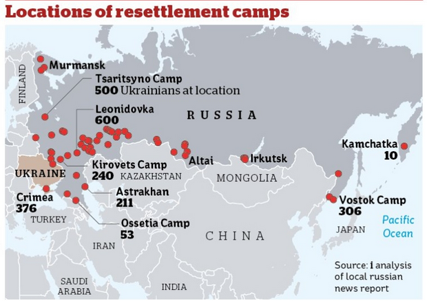 Временные пункты размещения обустроены в десятках санаториев и бывших детских лагерях, в одном центре "патриотического воспитания" и даже на бывшей свалке химического оружия. Они простираются через огромные русские степи и через 11 часовых поясов над Уральскими горами от Белгорода на западе до удаленного полуострова Камчатка на краю Тихого океана и Владивостока в конце Транссибирской железной дороги.