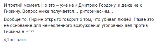 "Гиркин открыто говорит о том, что убивал людей. Разве это не основание для немедленного возбуждения уголовных дел против Гиркина в РФ?" - задает третий, риторический вопрос Слава Рабинович.