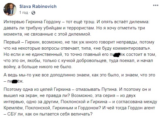 Слава Рабинович также обратил внимание на то, что получив от Гиркина традиционный ответ насчет сбитого над Донбассом малазийского Боинга, в котором он отрицает причастность боевиков, украинский журналист не спросил его прямо: кто же тогда это сделал?