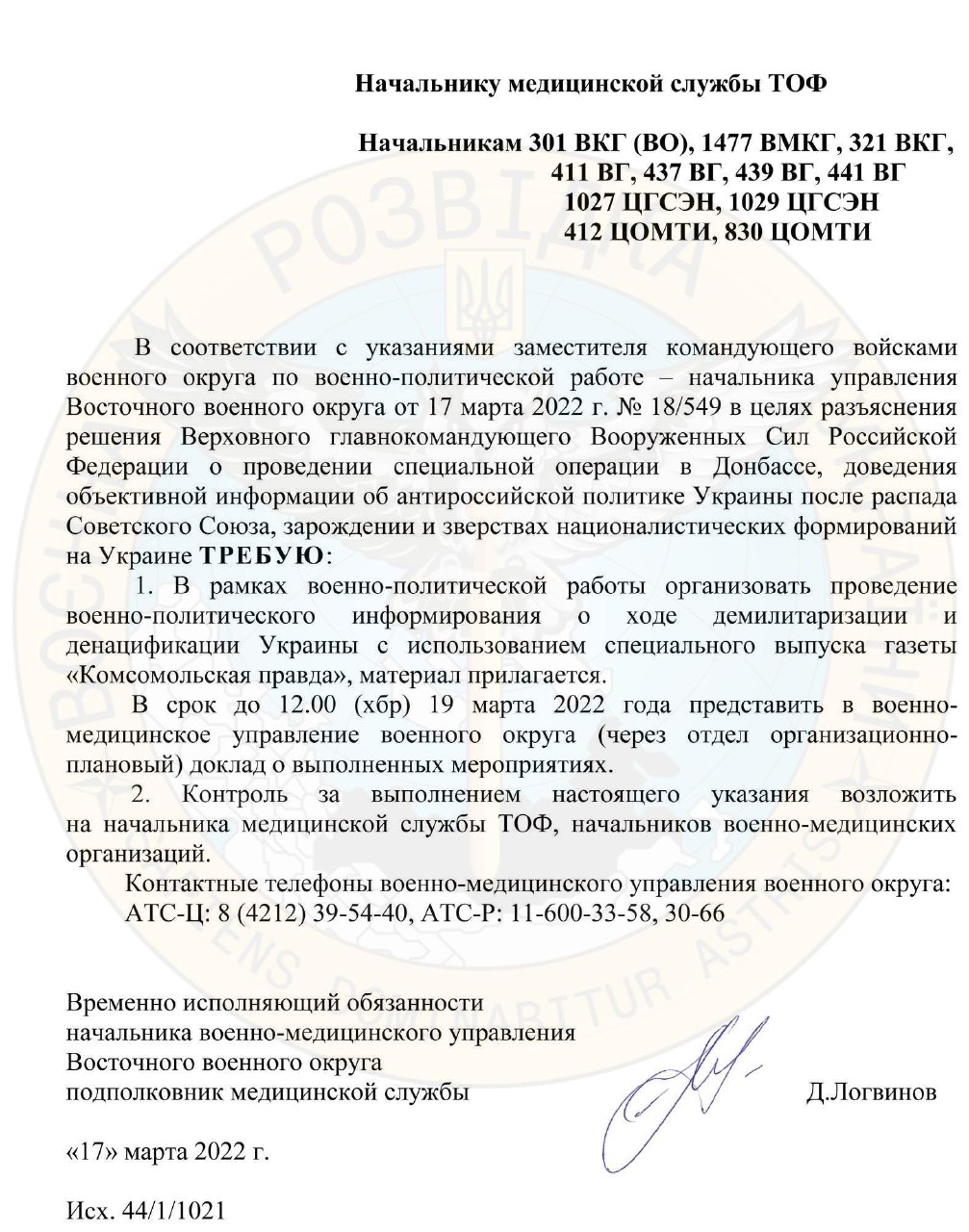 Так разведчики узнали, что соответствующее распоряжение дало военно-политическое управление восточного военного округа РФ. Оно настаивает на организации проведения военно-политического информирования о ходе демилитаризации и денацификации Украины с использованием спецвыпуска вышеуказанной газеты.