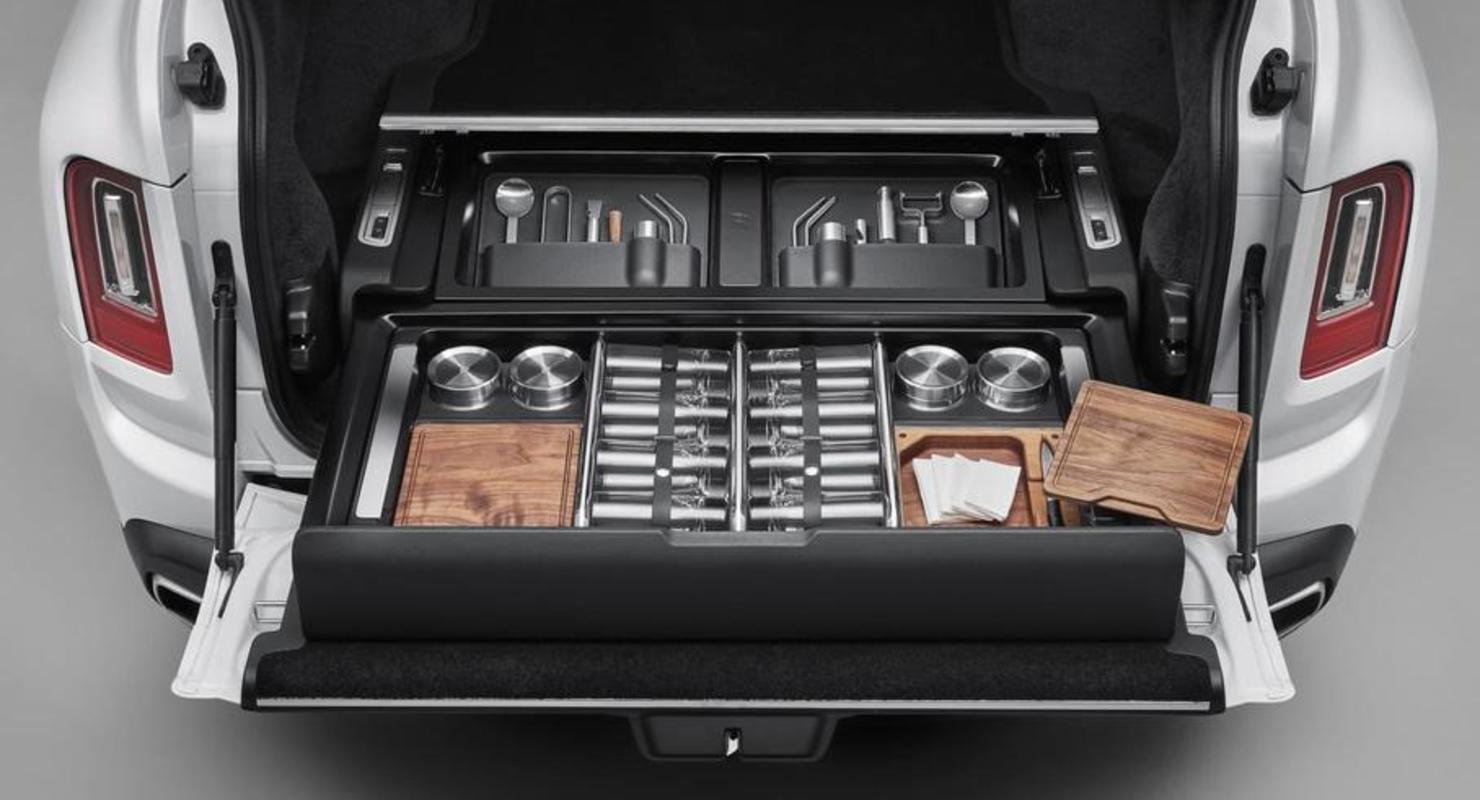 Ящик съемный, его можно оборудовать барным и кухонным набором, содержащий доски, ножи, оборудование для смешивания коктейлей и бокалы Highball с монограммой от Rolls-Royce.