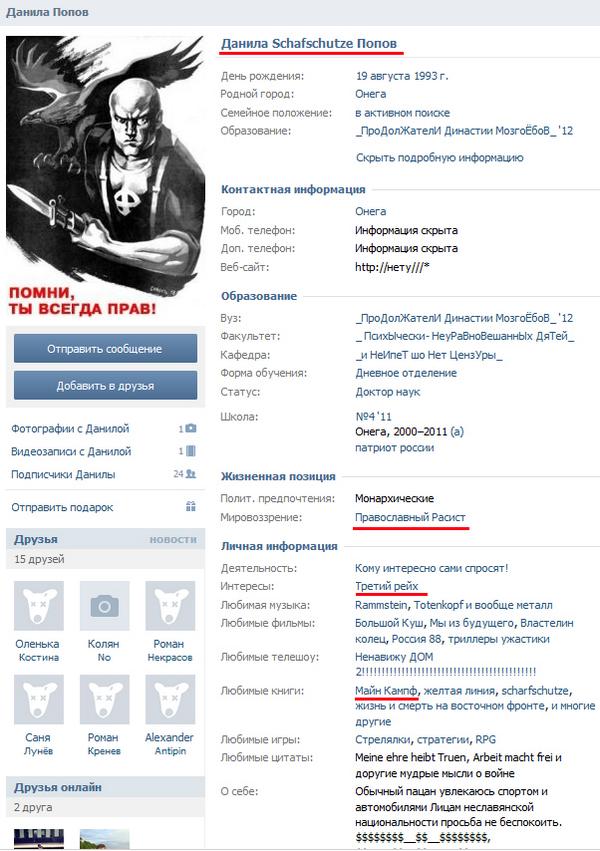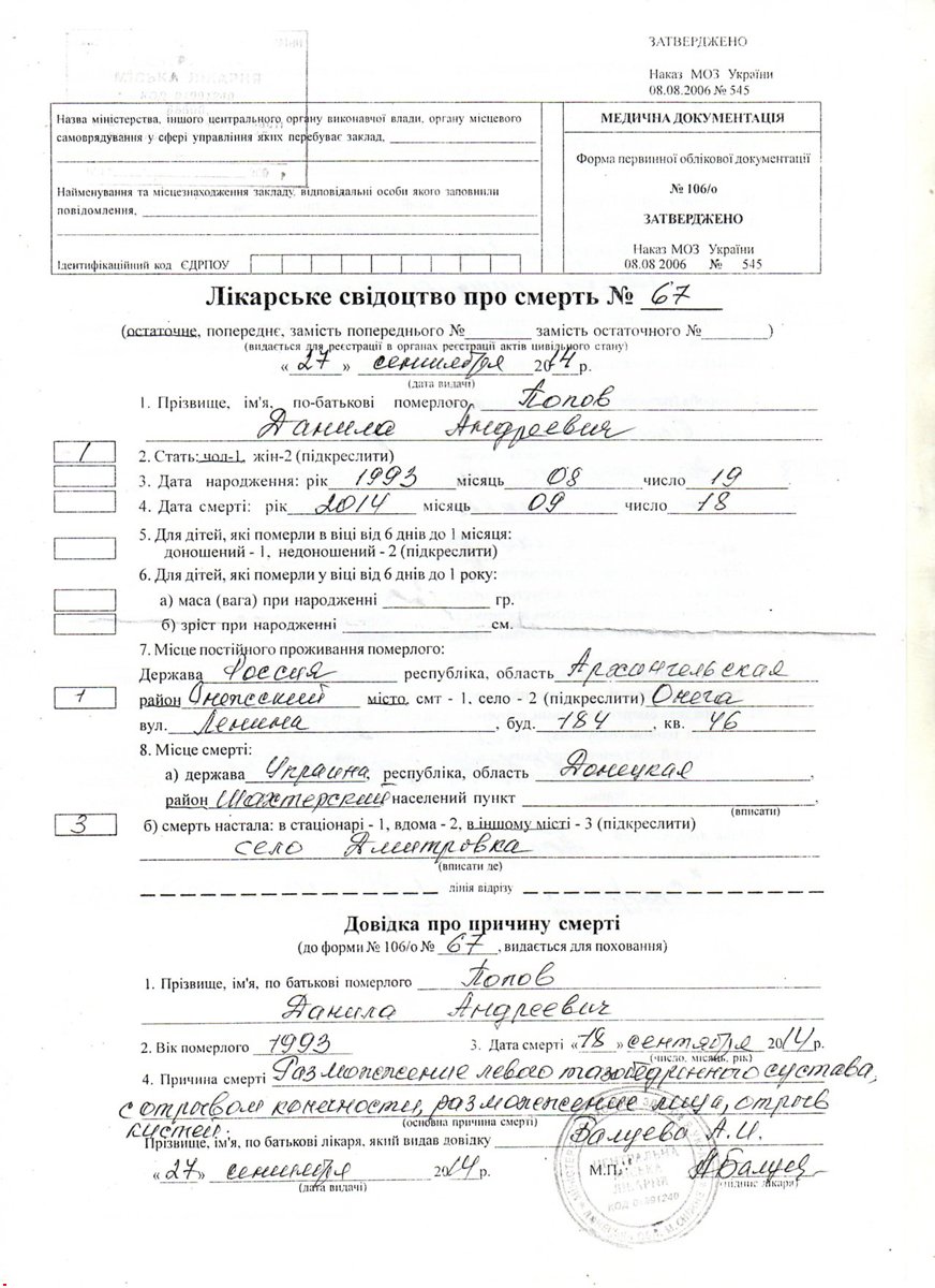 "Антифашист" Данила Попов. Убит в Украине... Документы о смерти, похоронен в г. Онега Архангельской области", - написал он.