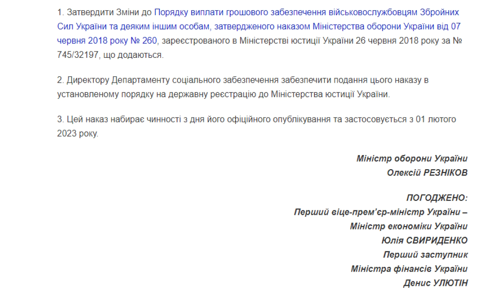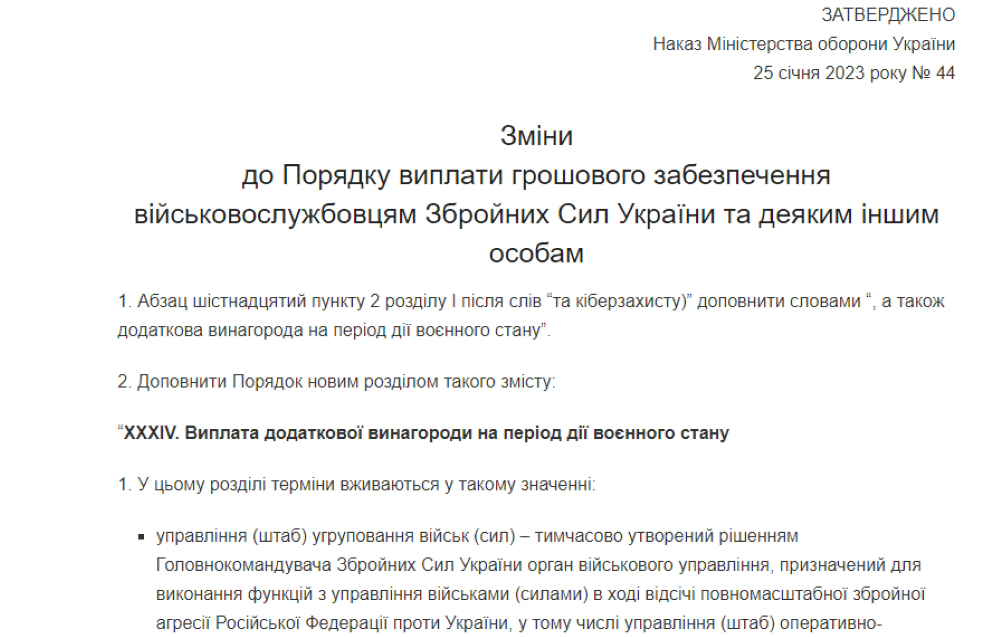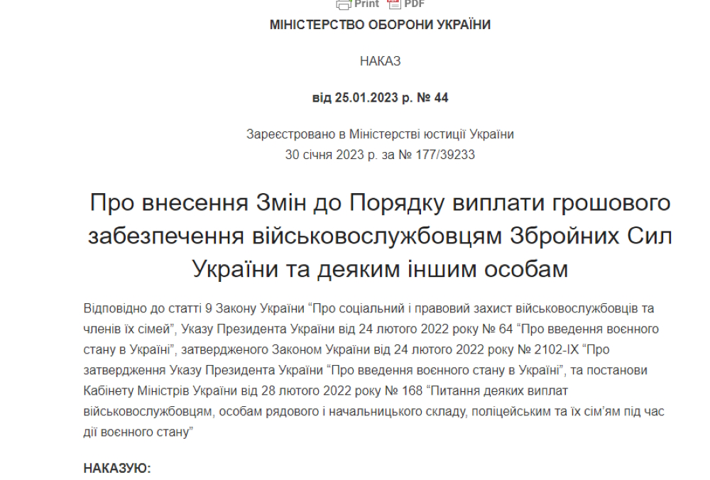 Приказ МОУ от 25.01.2023 г. № 44 "О внесении Изменений в Порядок выплаты денежного довольствия военнослужащим Вооруженных Сил Украины и некоторым другим лицам" размещен на сайте VOBU.