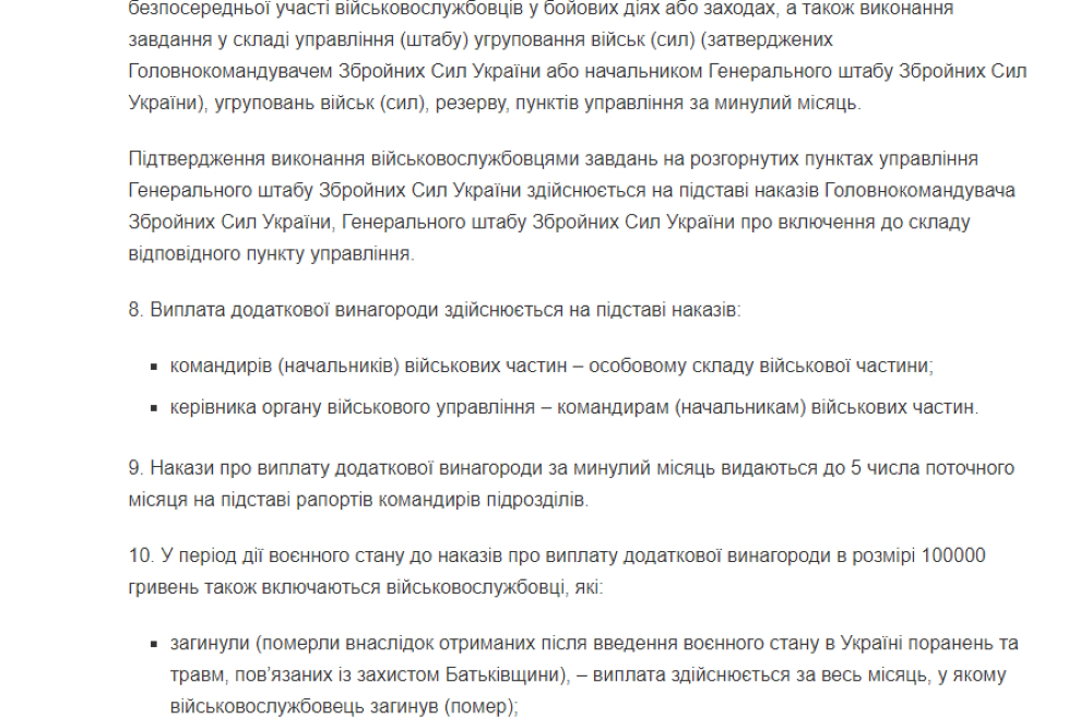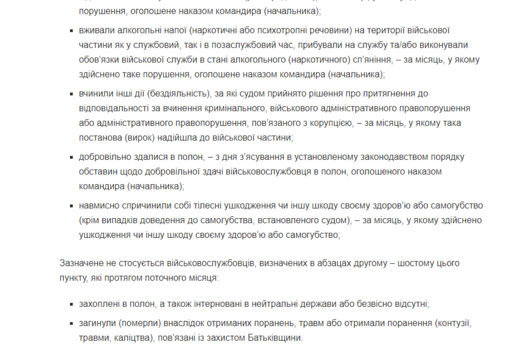 Дополнительную месячную выплату, которая установлена в размере 1 тысяча гривен в день отменят военнослужащим и сотрудникам системы МВД, которые находятся вне зоны боевых действий в глубоком тылу, солдатам срочной службы, курсантам вузов, а также некоторым другим категориям.
