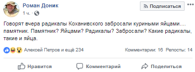 "Говорят вчера радикалы Коханивского забросали куриными яйцами.... памятник. Памятник? Яйцами? Радикалы? Забросали? Какие радикалы, такие и яйца", - написал он.