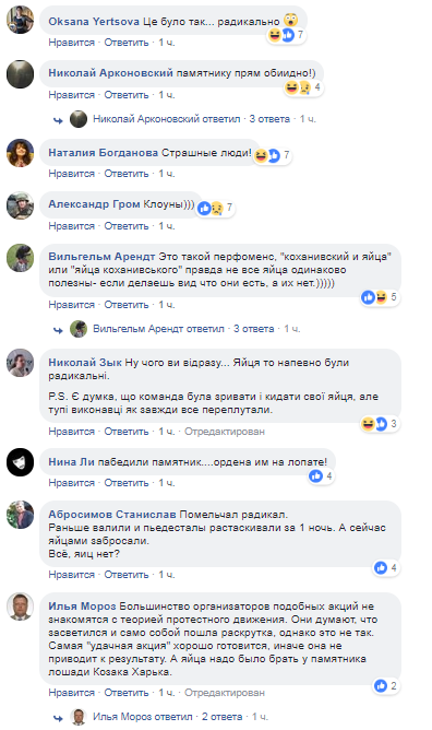 "Это было так... радикально", "памятнику прям обидно!", "Страшные люди!", "Это такой перфоменс, "коханивский и яйца" или "яйца коханивського" правда не все яйца одинаково полезны- если делаешь вид что они есть, а их нет.)))))", "Помельчал радикал. Раньше валили и пьедесталы растаскивали за 1 ночь. А сейчас яйцами забросали. Все, яиц нет?", - и т.д. пишут комментаторы.